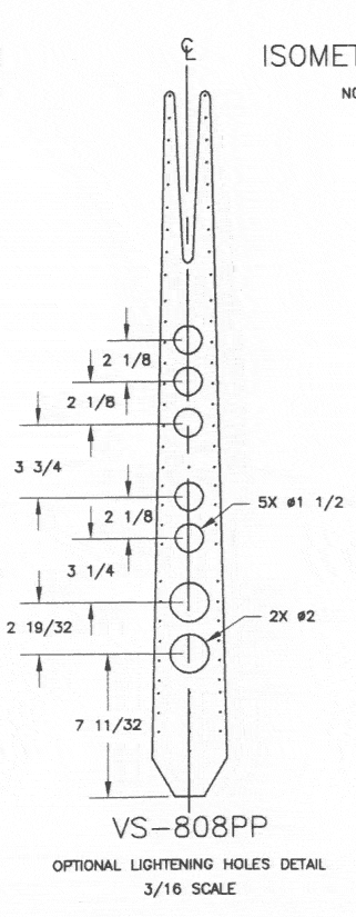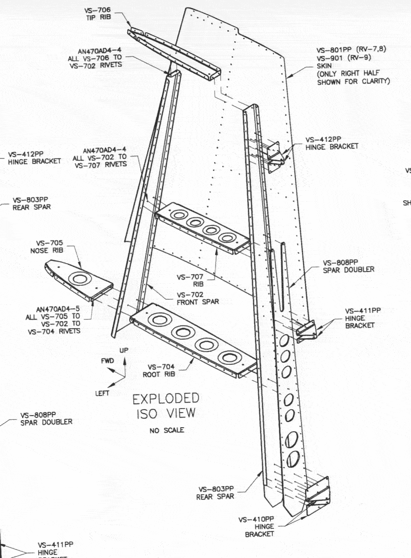 Vertical Stabilizer Construction of the Vertical Stabilizer (VS) is similar to that for the Horizontal, except it is easier, and perhaps should be done first. 1. Reading the Plans, building the skeleton Did I tell you how important it is to read and re-read the plans? The VS plans below show the skeleton with one half of the skin applied. In the large image you will see details like rivet call-outs (e.g. AN470AD4-4 all VS-708 to VS 702 rivets). This simply means Universal "round head" rivets (AN470) of width (4) 4/32" and length (-4) of 4/16". Fortunately Van labels these supplied components well. Basically if you are riveting a number of sheet components together you need a longer rivet, and you must end up with the correct protruding lengthm (1.5 x diameter) to give a good manufactured head dimension. The correct call-outs guarantee this. All the skeleton components must have their rough edges smoothed with the Scotchbrite wheel. Then they are clecoed together and match-drilled to final size. The skins are added and remaining holes are also match-drilled. Then all is disassembled, and every hole is deburred and dimpled if required. Some holes are not dimpled and some are, so it pays to be careful and double check here. Flush rivets are used on the forward surface of the rear spar to give a flat surface where it will abut against the furelage. The rear spar reinforcing plate and rudder bearing attach flanges are also added, drilled and deburred.