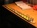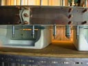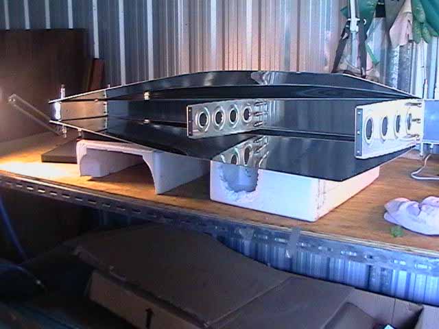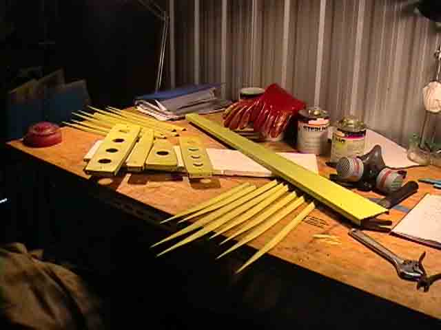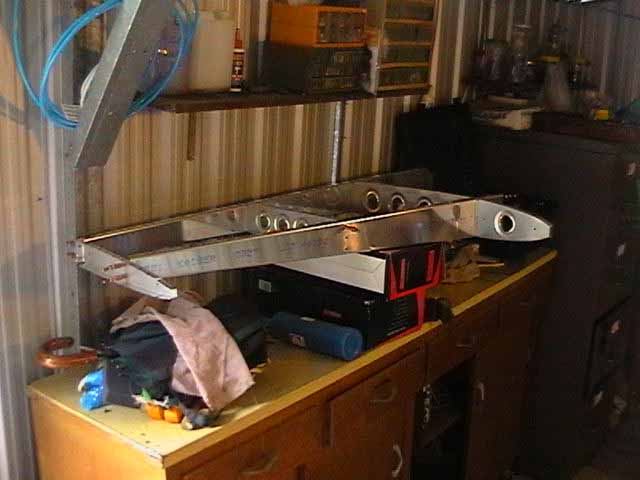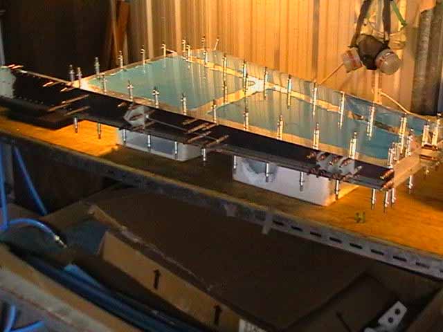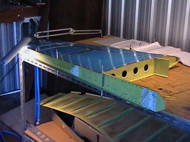 2. Finishing rear spar, priming and riveting The rear spar reinforcing plate needs two large holes (2" diameter), and five smaller holes (1 1/4" diameter) made to reduce weight - see the drawing for details and dimensions. I used holesaws for this, using slow drill speed, very light pressure and heaps of kerosine to lubricate. It was messy as the hole-saws tend to bind. It would have been better with a good fly-cutter. As with the HS, everything was then treated with primer/sealer, including a light coat to the inside skin surfaces. The rear spar is reveted together, flush rivets being used where it will mate with the fuselage. The skins are then riveted to the front skeleton (without rear spar at first). Once your technical counsellor has checked your work, you can button-up this assembly and move on. My last image shows the rear spar fastened with clecoes, ready to be checked and finished.