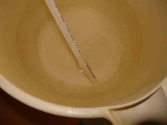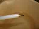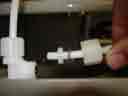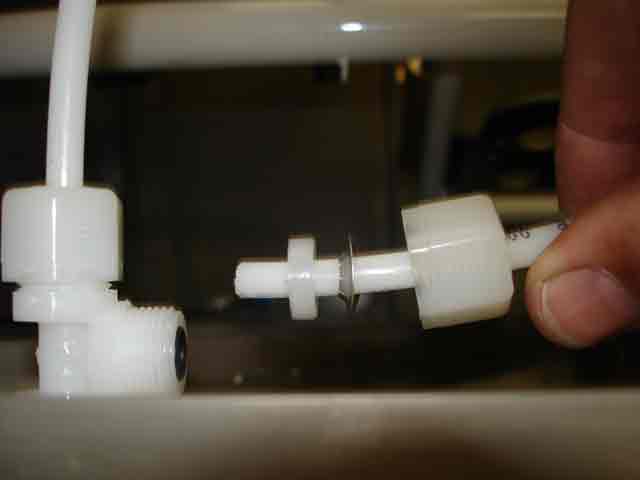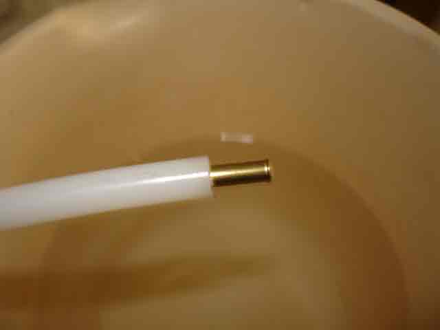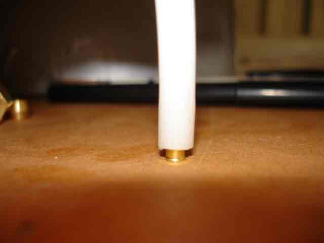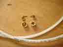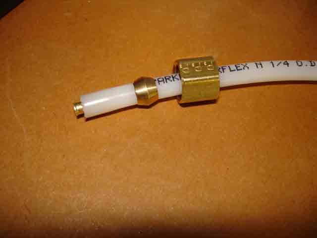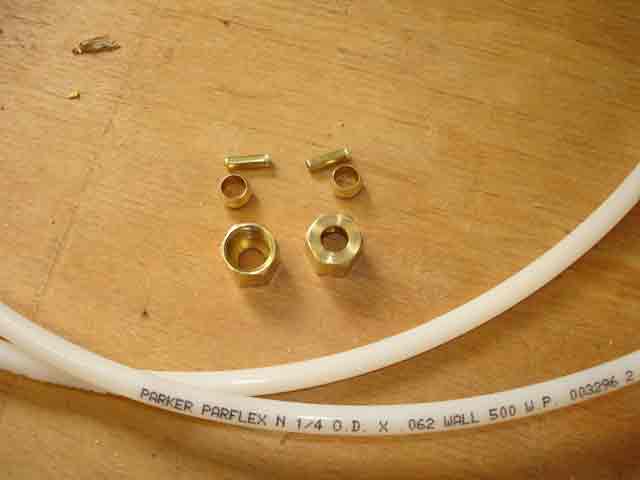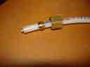 The next trick you have to learn is how to construct these plastic line end fittings. Image 6 shows some of this line and pairs of end fittings - threaded nuts, collars and ferrules. First the ferrule goes in the line. It helps to use boiling water (image 7) to soften the line first, and then you can puch the ferrule into initial position by hand (image 8).