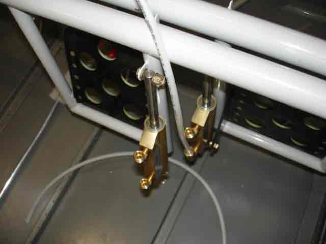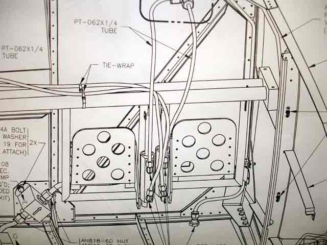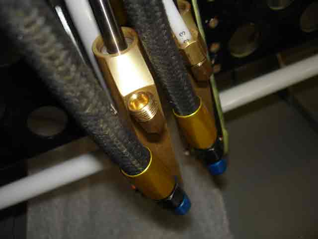 The brakes on an RV-7 are hydraulic. I chose to install brakes on both sides, as I hope to share the flying with colleagues with right-seat pilot experience, and it just seems natural to me to allow for all possibilities. Images 1 and 2 show the setup for left and right brake-pedal assemblies respectively. Image 3 shows the left rudder bars with brake cylinders attached, ready for brake lines. The large black lines (image 4) run over the top of the rudder bar assemblies and connect with two angle unions which traverse the firewall. These will eventually supply the brake slave cylinders via lines down the gear legs. All the other high pressure leads are actually made from "Parker" plastic line connecting to brass angle fittings. Each line end has a small brass furrule that fits inside the line ID, and a tapered brass collar that fits over the lines. Image 5 shows one of these thinner white lines connected to the right master cylinder. When cutting these lines you have to be careful to allow enough length so that there are no repetitive stresses or wearing actions imposed as teh rudder pedals are moved throughout their full arc os movement. This is quite hard to get right. You do not want brake lines wearing and then leaking brake fluid inside the cabin. The final image on this page shows the finished result which seemed to work OK.