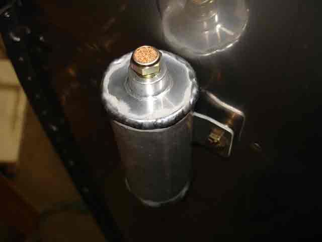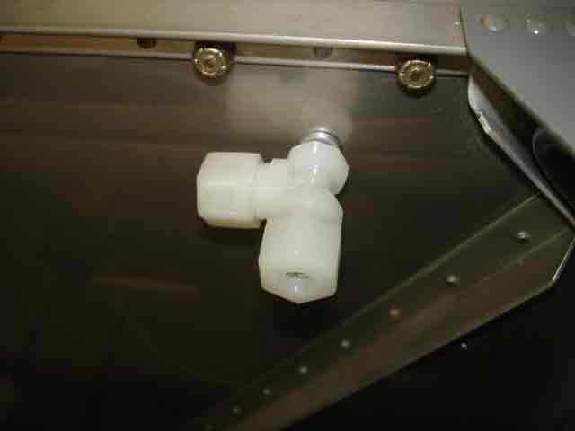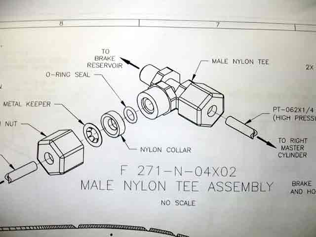 The brake fluid reservoir is bolted to the right hand forewall on the engine side (images 4 and 5). You have to cut a hole 4 1/2" inboard for the plastic reseroir connector (image 5), and use washers as spacers so that the top lip of the reservoir does not foul the angled part of the upper firewall. Image 6 shows one of teh two (L & R, image 7) low-pressure plastic connectors to this fitting.