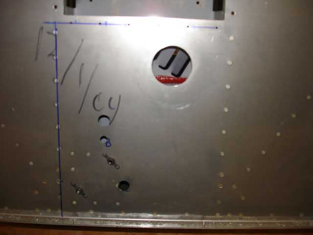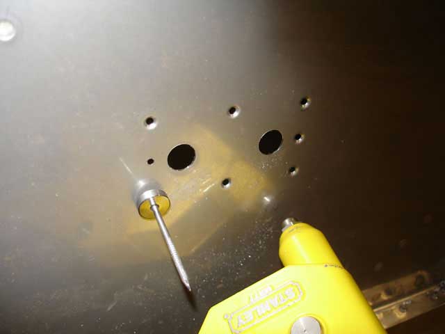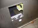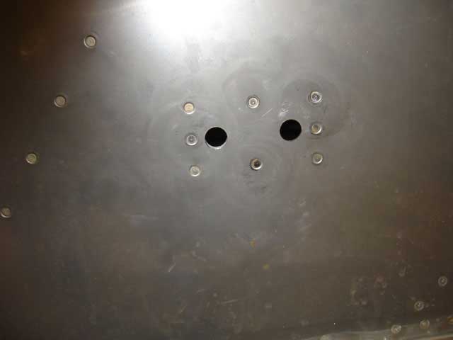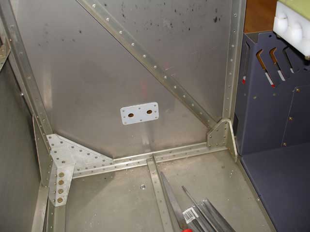 The hole-cutter was then used to make two 7/16" holes at these locations (see image 1 below). When both holes were cut I removed the plate and used the pop-rivet dies to dimple the 8 firewall rivet holes (image 3). I then countersunk the plate on one side, primed, and used the gun to shoot the rivets in place (image 4). Image 5 shows this plate positioned from behind. Imahes 6 and 7 show the central rudderbar support plate riveted into position. You must do this BEFORE riveting the recess into place for access reasons.