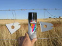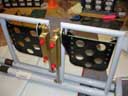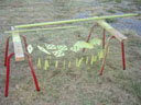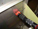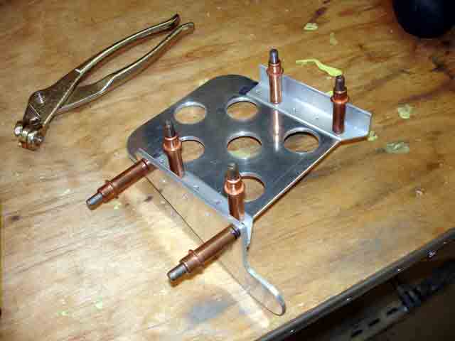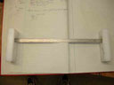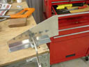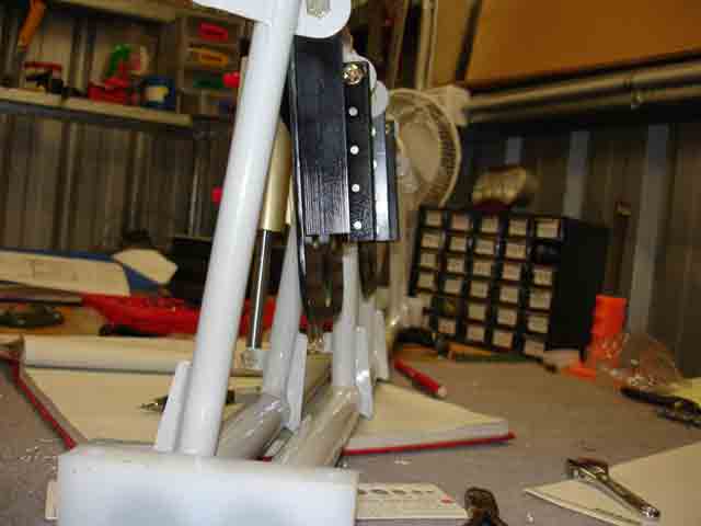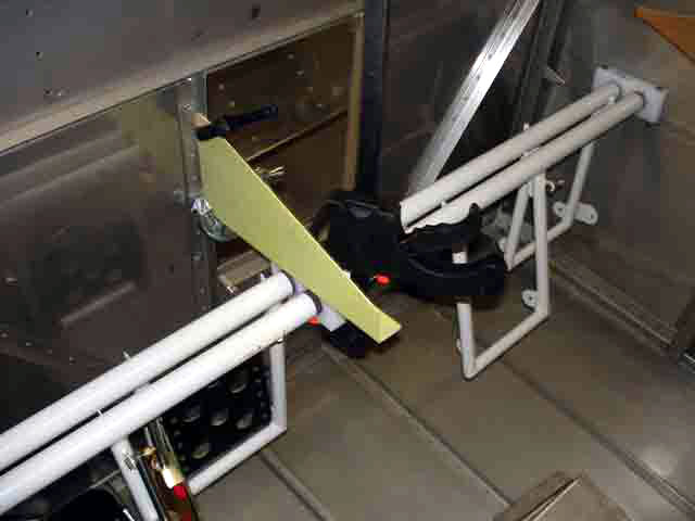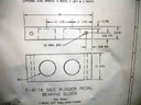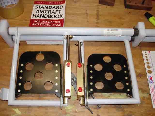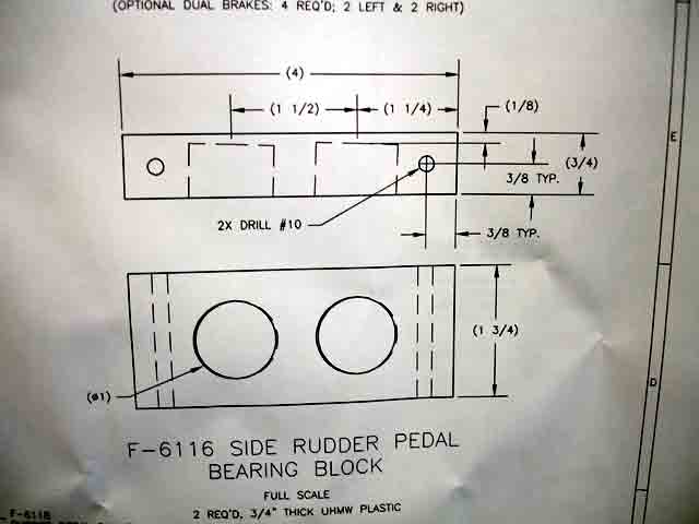 (17th April 2006) The rudder is controlled by means of two powder-coated steel weldments which fit into the foreward fuselage, just at foot level. Each footrest has bolted to it a pedal which, when pushed foreward, compresses a master cylinder activating the brake on that side. The weldments lie across the fuselage as shown in the first image - I did this to test for adequate knee room when finding the best position for the rudder controls. They are supported by three teflon bearings: at each end of the shafts, one is bolted to a longeron. A third is attached to an aluminium plate suspended from the firewall. In the second image I have placed a ruler between the teflon bearings, with its square end flat against the inside surfaces. Notice that the bearings are NOT square. The large holes bored into these blocks lie at a slight angle, so as to compensate for the taper of the fuselage longerons to which they are bolted. This is seen in the image of the drawing (image 3), but not mentioned in the construction manual. You could really stuff up here if the bearing blocks were in the wrong position or orientation. The next image shows the piece of angled Al sheet which will support the centre bearing - with a notch removed for the firewall inset. The following image shows the basic pedal construction. I primed all the bits (brake pedals, tank support bracket components [see 2.1 above], elevator push rods and bell crank bits), and even painted the brake pedals - they will see a lot of use I hope. Note I used a spray metal undercoat and black enamel for the two steel tank support brackets. Rust prevention.