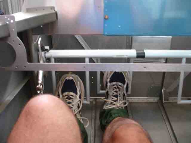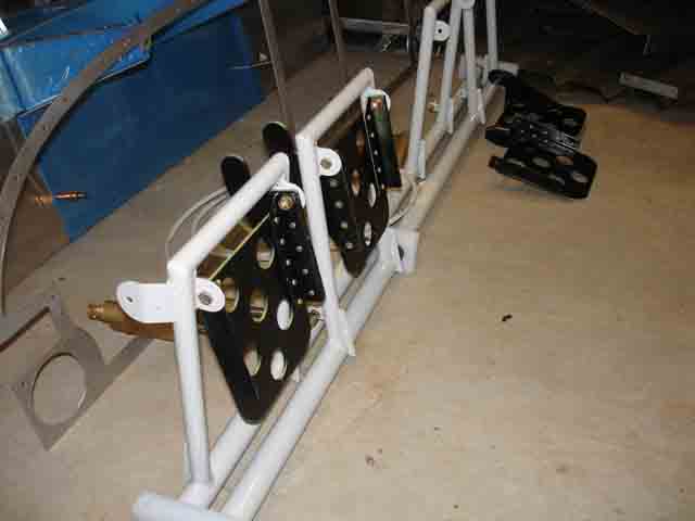 (20th April 2006) The angle that the brake pedals makes with the rudder bars is critical for obvious reasons. Set them at different angles and you will always have one brake on before the other. Set them too far back and you will ride the brakes when taxying. Set them too far forward and you might not be able to reach them. I managed to scare a few people on the Australian RV-7 Builders' email list by naively asking whether I should bolt the brake pedals parallel to the rudder bar frame. The first pic below shows why this is a stoopid suggestion. The rudder bar pivot rods lie one in front of the other. To have the bars in line, the frames for left and right bars must be positioned at different angles in the fuse. So the brake pedals must also be positioned at different angles relative to the rudder bar frames. I have decided to wait until it is absolutely necessary to drill these holes, and then hopefully to do so with my feet in position to get the best angle.