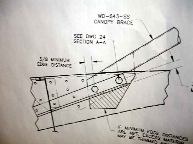 Image 1 below shows how I attempted to reduce the width of the roll bar. It certainly helped, but in the end I had to apply a little pressure to the bar to get everything lined up. Image 2 shows how, fortunately, I did not need to use any shims to get my roll bar square. Thank you, quickbuilders in the Phillipines!! Image 3 shows the roll bar in FINAL position with EXACTLY 7/32" between the edge of the flange and the fuse edge, on the left side. The right side was not so good (6/32"), but Support@vans said that it would be OK. The next two pictures are with the front skin clecoed in place. You can see that the edges of the skin and the roll bar line up pretty much. Image 6 shows the roll bar bolted in final position, without the central brace. The central brace is a piece of powder-coated steel tube which bolts (1/4") to the centre of the roll bar up top, and which bolts (3/16" x 2) to the reinforcement angle of the front superstructure below. Images 7 and 8 show the dwg and actual components of this lower attachment.
