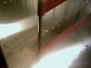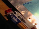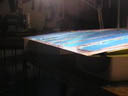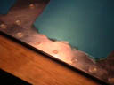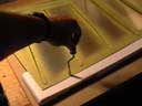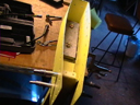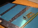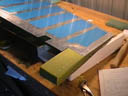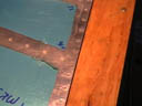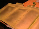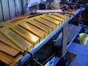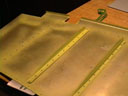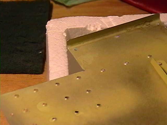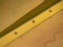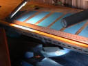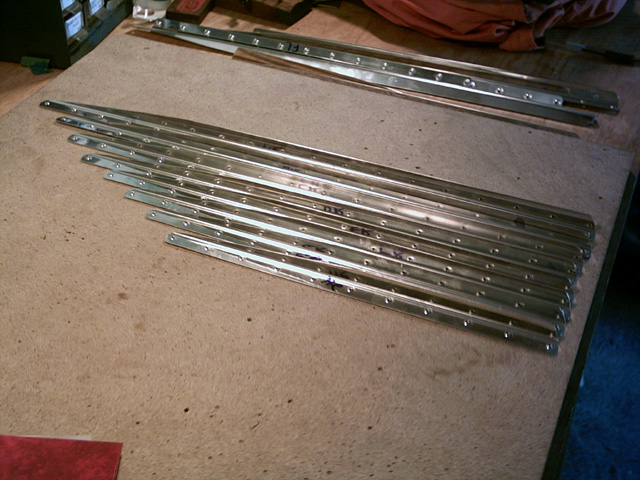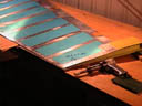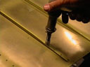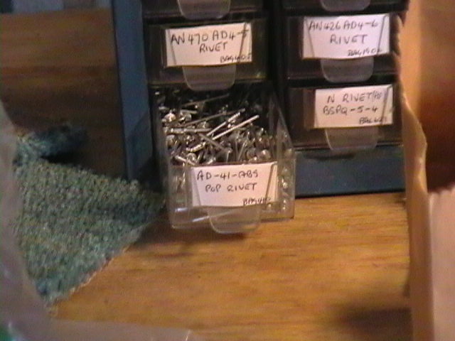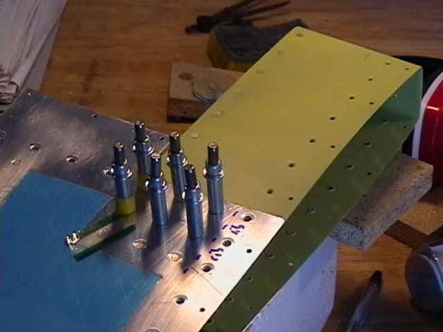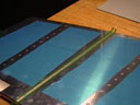 Rudder In 2002. Van's changed the rudder design of the RV-7, increasing its size to improve spin recovery performance. My rudder is the larger version. This is the first component with a sharp trailing edge, and according to the plans and instructions this needs care. 1. Stiffeners First job is to cut and trim the rudder skin longitudinal stiffeners. There are 8 for each skin. They are clecoed to their respective skin and match drilled. All holes are deburred and dimpled and then stiffeners and inside skins are treated with Alumiprep and Alodine, and primed. Rivets are installed from the outside and held in place with riveting tape adhering to the surface along the rivet line. The skin is turned over and the appropriate stiffener is laid along the skin with rivets protruding up through each hole.