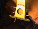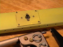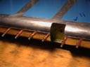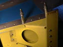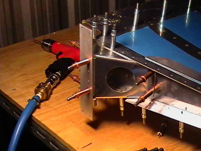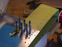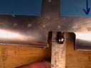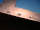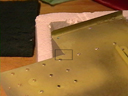 2. Riveting stiffeners to skins Once the stiffener is in place, double check the position of the back-riveting plate and set each rivet, moving the back plate as needed. The third image below shows a high mag view of three rivets, the middle one is yet to be set. Once the skins are complete, the front spar, ribs, reinforcing plates and trailing edge are all clecoed to the skins to build the rudder, ready for match-drilling. A small spacing shim is also fabricated from 0.032" sheet. The rudder horn brace needs to be trimmed and fitted between the lower rib and control horn as shown in the 4th image below. All is match-drilled, disassembled and deburred (including skins). All internal components are dimpled and have edges smoothed with the Scotchbrite wheel and a pad.