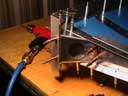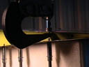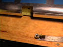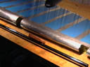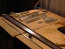 6. Rolling the leading edge and finishing The next heart-stopping job is to roll the leading edge. I bought a 1" shower rail (steel/chrome) from Bunnings, and taped it inside the leading edge as per Vans suggestions. A vice-clamp on the rail provided the necessary leverage. Before rolling I used my hardwood edging tool (thanks for this tip Sam Richards) to impose a slight bend of the outside leading edge, in the direction of the curve. The tool is just a piece of hardwood (see in 1st image below, leaning on chrome rod) about 3 " wide with a long slot cut in it. You insert the edge in the slot and work it up and down while imposing a bending moment to bend about 5mm of the edge in the required direction by 1 or 2 degrees only. This gives a nice snug edge closure when you rivet together. Rolling the edge was not straight forward. Take your time, and be careful not to over stress the upper right angle edge where the skin is riveted to the counterweight assembly. I used the rod to bend things about 1/2 way, and completed the job by bending carefully by hand. You just have to avoid applying any high curvature stresses. Once the edges are close enough, cleco together. You should have drilled out to #30 first (I didn't, and had to debur the holes in rolled edge - not easy). Pop-rivet together and Bob's your uncle. The final job is to screw in the three bearings linking VS and rudder. The offsets from the front spar are given on the plans to the nearest 1/64". I use the jam nuts to indicate this height and screwed them in with a piece of the shower rod, squashed to approximate the bearing head dimension. OK it was not pretty, but it worked!.
