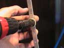 3. Trailing Edge Preparation The trailing edge is formed by the skins meeting over a thin, long, wedge-shaped piece of aluminium, pre-drilled to match the rivet holes in the skins. Apparently, getting the trailing edge straight and true is one of the more difficult tasks in the empennage. You make a tremplate out of a piece of angle aluminium, match drilled to the trailing edge hole spacing. Notice the jack and piece of ply lifting the sag out of my bench edge for this operation. The actual trailing edge wedge has to be double-countersunk to take a dimpled skin on either side. Small flush rivets are driven into each dimple, and the resulting "double-flush" rivet finish is strong and, if straight, apparently a pretty good-looking finish. We shall see! Before attempting this, I riveted the horn brace and rudder horn top the lower rib, and I also riveted the reinforcement plates and bearing platenuts to the forward strut. It was a lot of squeezing, but the finish is not too bad at all, and it all seems strong and true so far. The next stage is to rivet the counter-weight rib to the spar, and bolt the counterweight in place. Before final construction, I made sure the edges and strain relief holes of both skins were smoothed, with all sharp edges and protrusions removed.