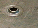 4. Counterweight and More Trailing Edge Preparation The counterweight rib and skin are riveted to the upper main rudder skins by six rivets (here clecoed). Next the top rib is riveted in, but first the technical counsellor has to check out the work inside. You need the thin "no hole" yoke to squeeze in this tight space. All was deemed OK and signed of on my SAAA "Builders Assistance Program" file. The top and bottom ribs were riveted in place, and then the skin was riveted to the front spar. Finally, I bought some Selleys "Super Strength" Araldite (epoxy glue), mixed a batch and coated the training edge wedge with a fine layer. I then clecoed together the training edge, using a straight piece of Aluminium angle to hold everything square and straight, as suggested in the plans. Finally, I "hung" the rudder from this piece of angle, so as to ensure equal stress on both sides of the skin. The final result with the trailing edge glued certainly LOOKS straight, however the clecoes had to be "coaxed" out of their epoxy bed, and the straight angle carefully "unstuck" from the rudder. The epoxy got into a few of them, and they had to be discarded. Note in the right-hand picture below, after the clecos were withdrawn, a few holes retained a little epoxy. This had to be carefully removed with a blunt punch (similar to removing rivet heads when drilling out rivets).