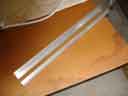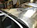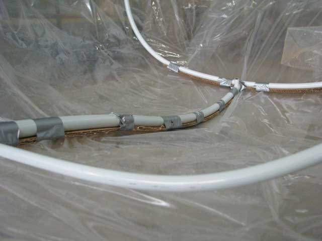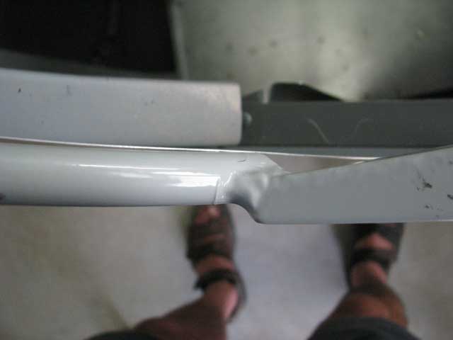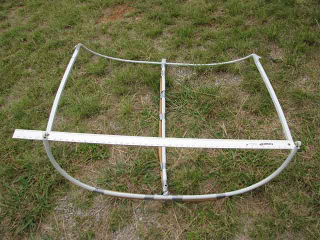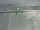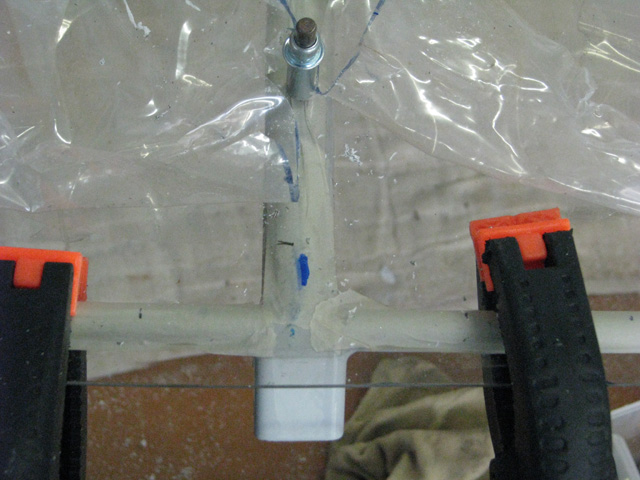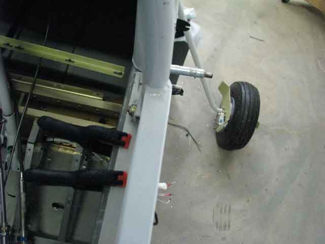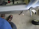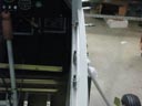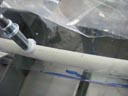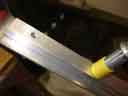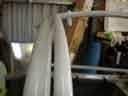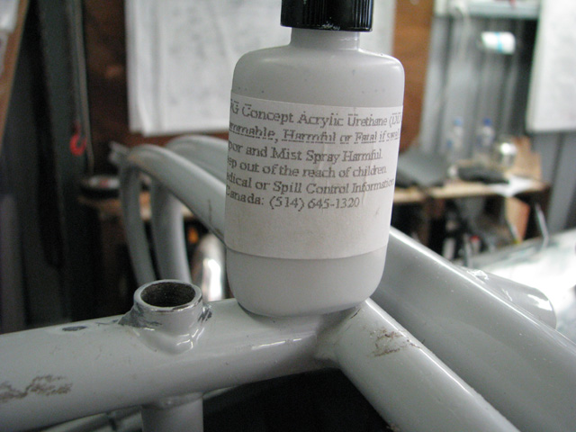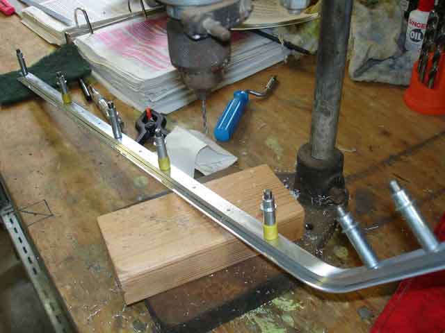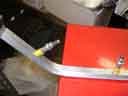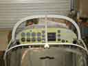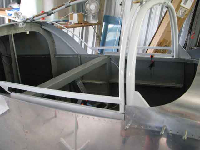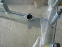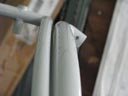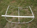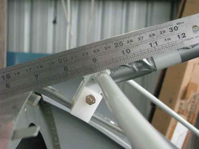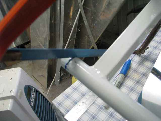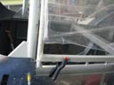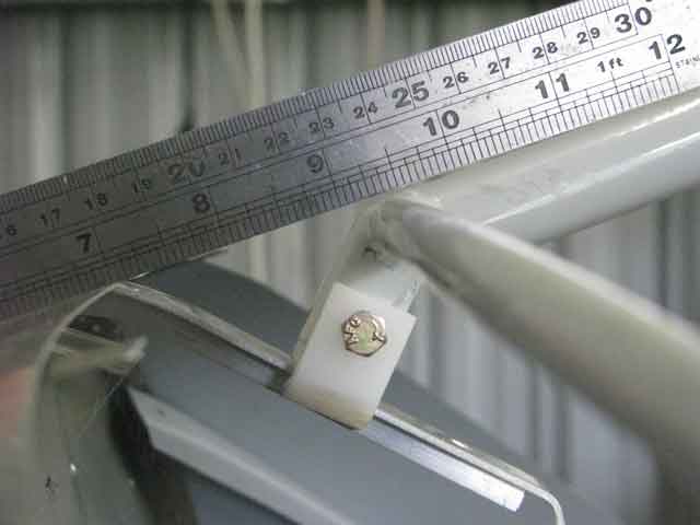 Many previous builders report that the sliding canopy instructions are none too clear, and I also found this to be true. The canopy consists of a clear perspex bubble which is riveted to a powder-coated steel frame. Ideally the frame shape should fit the bubble shape, but this only happens when the frame is located exactly in one front-back position. You cannot easily find this position, because the frame has a tube (about 1/2" diameter, 1/2" length) sticking up into where the canopy perspex will be. This tube takes the shaft of the rotating latch mechanism, and the first thing you need to do is find the "best " position of the frame to fit the shape of the bubble, note the position of the tube, and use a unibit to drill an appropriate hole so the tube can pass through the perspex. I decided to tape a couple of thicknesses of lengths of corrugated packing box material to the top of teh centre member of the frame. These lay snugly againts the bar, exactly matching its shape, and aligning well with the edge of the 1/2" tube (images 6 and 7). This meant that I could find the exact fore/aft postion where the shape of this bar best matched the shape of the bubble (image 7). The last image shows the final vertical position of the front canopy bow relative to the roll bar, after cutting about 3/16" off the front tube setions that fit over the runner wheels. I am sure every canopy frame is different here, so you need to cut as required (which may not be 3/16").