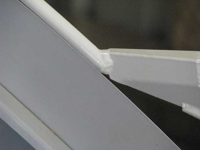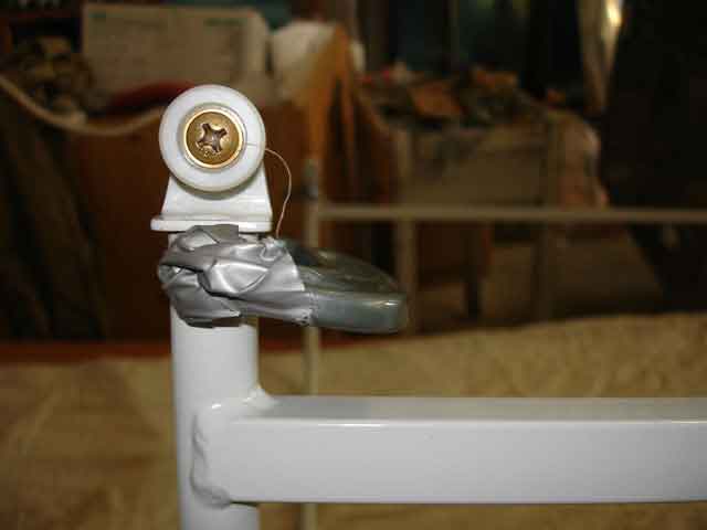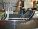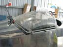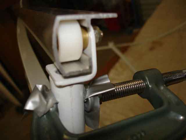 The sliding mechanism relies on three load-bearing points: at the front there are wheel assemblies (Image 1) which run in extruded aluminium section (image 2) and carry most of the sliding canopy weight. At the rear there is a single long aluminium "T" section on which runs a teflon block which can slide to and fro as the canopy is opened and closed. (image 3). There is a sturdy welded steel frame to which the perspex sliding canopy is attached.. Image 4 shows one of the two rear lugs which will eventually slide into a teflon block to hold the closed canopy in position. Image 5 shows one of the front wheel assemblys. Images 5-8 show various stages in the construction of the rear runner over which the rear teflon block slides as the canopy is opened and closed.