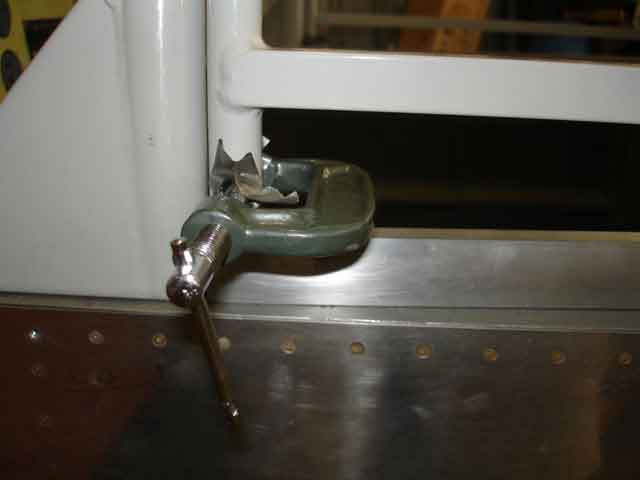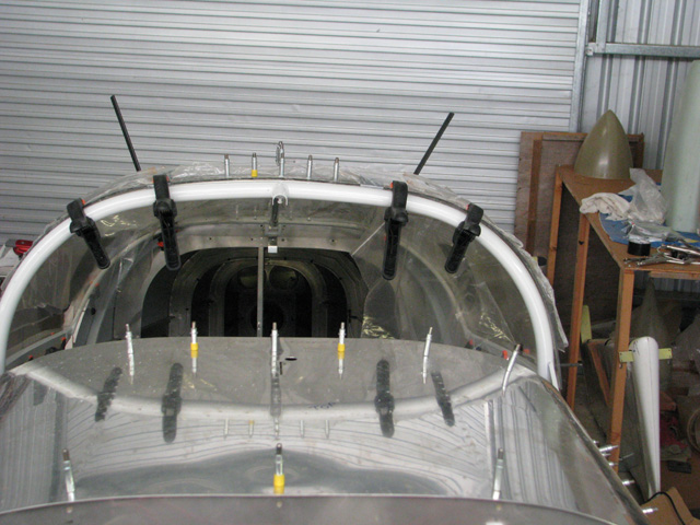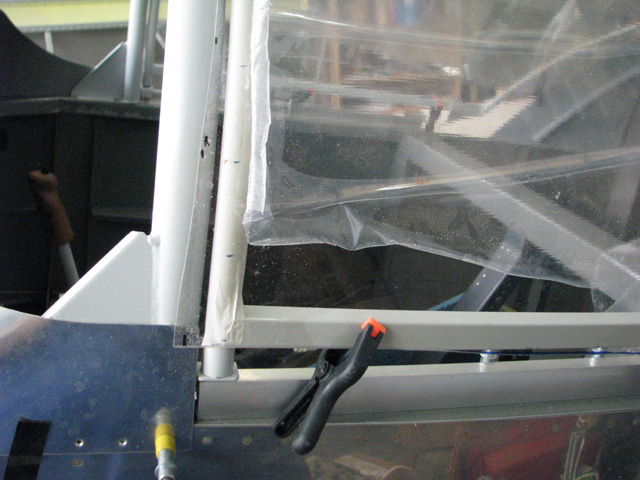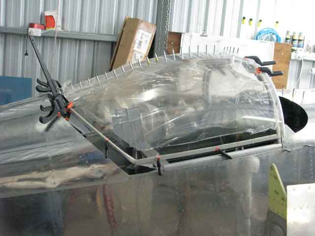 2. Because of the afre-mentioned difference in curvature, the free windscreen does not match the shape of the roll bar and front fuse skin. It has to be pulled into shape by clecos or screws into the roll bar, and little aluminium "clips" that drag the leading edge of teh windscreen down onto the fuse surface. One consequesnce of this is that the rear edge of the windscreen will almost always need trimming. It souldn't, because when you make the "BIG CUT", the rear edge of the 'screen and the leading edge of teh sliding canopy should meet perfectly without trimming. Be prepared to trim to get it o work.
