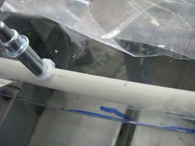 Double checking that the latch shaft was positioned in its hole, and that the centre member of the frame was over the centre line of the bubble, I clamped the frame in position and marked a cut line across the bubble as specified (image 8 above) and sealed the plastic either side of the cut line. I then used my Panasonic drill and a cutting wheel to slowly and carefully cut the canopy in two. It took about 20 minutes and there were no issues. I used tape to support the cut as it progressed, so there was NO possibility of gravity pulling on the cut. Once it was complete, i removed all the supporting tape and found I had a sliding canopy and a windscreen! (image 3). Image 4 shows the rear section of bubble sitting over the rear caonpy frame in position - notice how the bubble's radius of curvature is much larger than the frame's. The top latch shaft hole has weld material forming a gusset which interferes with the perspex adjacent to the hole in the perspex. I removed this material with a fine file, so there was no pressure on teh perspex from the gusset, and sealed the streel with Van's powder coat repair paint (Image 5). The next job is to clamp the bubble to the rear frame and drill 3/32" holes every 2" through the perspex and the top centre fram member (images 6-8). these holes will later be expanded to 1/8" (frame) and 5/32" (perspex), to take retaining rivets.