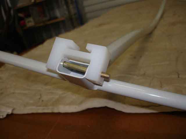 More of the critical stuff is shown below. Image 1 is a rear view of the canopy frame and roll bar (the thick one at the front). Image 2 shows the detail drawing of the left roller bearing. It is formed by a teflon tube mounted into a powder-coated angle weldment which has a steel tube which snugly fits into the ends of the front bow of the canopy frame. Image 3 shows the locating rear pins which are welded to the rear frame. When the canopy is closed, these should slide neatly into two holes, one of ech side, which are in two rectangular plastic teflon blocks. Image 4 shows the details of these blocks and their mounts. Obviously the final positions of the runners and these pins and blocks are critical, and should only be finalised when the canopy frame and perspex are complete and attached to each other. Image 5 shows how a small G-clamp can hold the canopy frame and roller together. I found it more useful to use adhesive tape as a shim to give a tight, but adjustable, fit.The rough vertical position of the canopy frame should be about 3/8" above the roll bar (image 8). The true position is not available until you make the perspex canopy and windscreen and attach them both to the canopy frame and roll bar respectively - so Iwaited until this stage before finalising this arrangement (which is done by drilling holes through canopy fram and roller mount tube, front to back, and inserting AN3 bolts and nuts.Image 8 shows that things are not quite right, because the horizontal square bar of the canopy frame is not yet parallel to the fuselage deck - it has to be parallel. Clearly, you cannot go much further with this without getting stuck into the perspex bubble, to make the sliding canopy and windscreen. Image 8 shows that there is about 1/16" "inset" between the fuselage side and the square section horizontal member of the canopy frame, as per spec. However - when you add the bubble to the frame, the bubble distorts the frame by about 1/2", so you really should bend the canpy frame so that it is about 1/2" less wide than the fuselage, when not attached to the rollers in their guides. Van's instructions are difficult to understand here. They tell you about this expected spreading of the canopy frame when the perspex bubble is attached, but they ask you to bend the fram so that its final shape (no bubble) lines up with the fuselage sides. Remember, the roller guides will CONSTRAIN the rollers to their correct location, however if you follow Vans instructions, you surely will end up with these rollers exerting an outward force on the guides because of the spreading action of the perspex canopy on the frame. This is exactly what happened to me.
