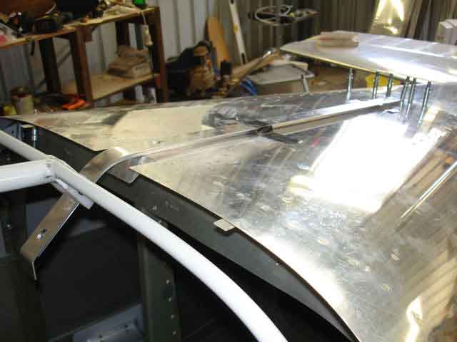 The first image below shows the detail of how this runner is fastened to the top fuse by -6 size countersunk screws . I stuffed up and drilled the runner with larger holes than indicated, so I have had to replace the -6 gauge screws with larger -8 gauge screws and nuts - no big deal. One modification I did employ was to set the position of this runner in what seemed the best place to give the best location of the rear of the sliding canopy, and install ONE ONLY screw at the front, and a strip of duct tape at the rear to hold it in lateral position. You need to do this while shaping the canopy, because duct tape will just not hold the runner in place while it is experiencing loads from the sliding canopy. The idea was that if this position was not optimum, I was free to alter the locations of the other screws appropriately, amd extend the hole of the installed screw to allow it to move to the new optimujm location. The second, third and fourth images are (1.) a drawing and (2+3)pictures showiing the teflon bearer which slides along this runner, and the final shape of the runner as it is riveted together. Image 5 shows the runner installed with black duct tape on the rear top fuse skin. Image 7 shows the canopy frame in place, with the runner supporting the rear canopy. Image 8 shows the vertical spacing of the front bow of the canopy frame relative to the roll bar. The gap is a bit big, and later I had to fix this by sawing off some of the front tube which located the front wheel assemblies.