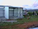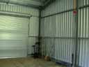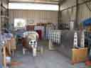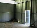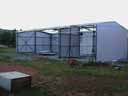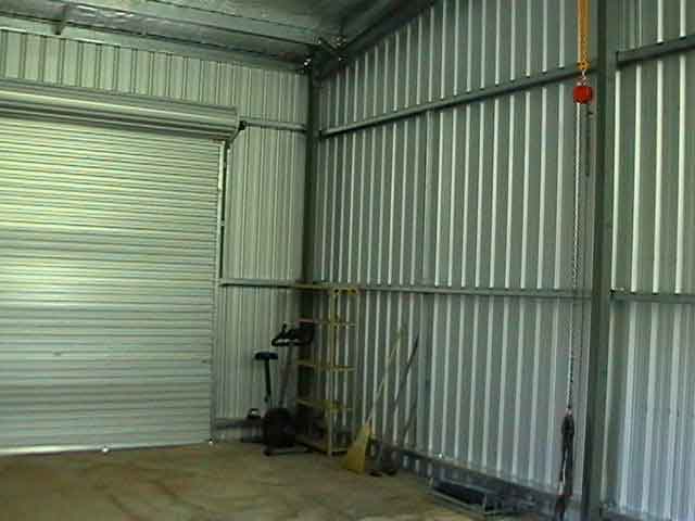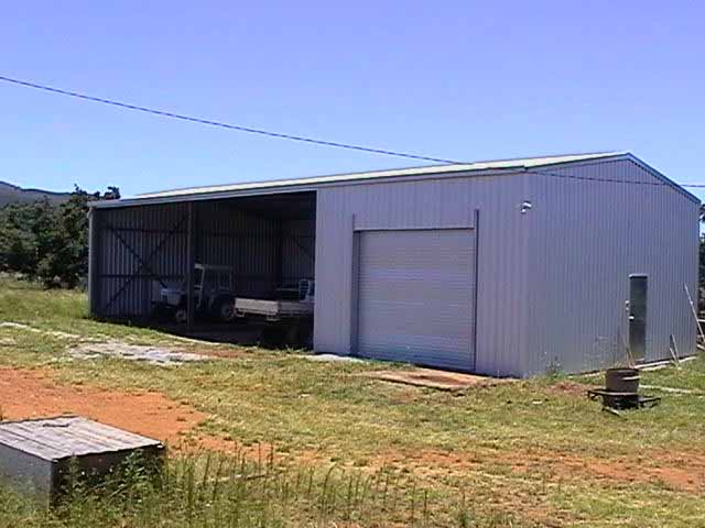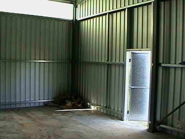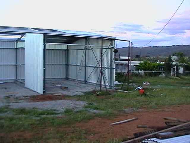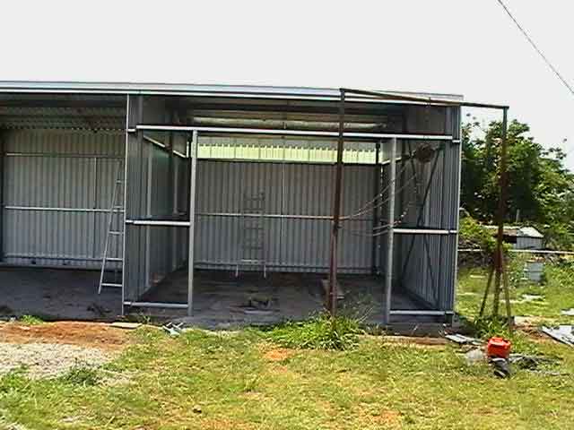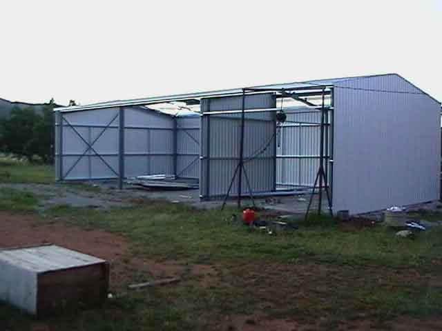 The structure is all steel with a very heavy I-beam frame supporting perlins and roof beams. Inside the enclosed workshop I have added an extra I-beam carrying a roller gadget which supports a 1/2 ton chain block - useful for lifting engines etc. The shed/ workshop was finished in mid December
