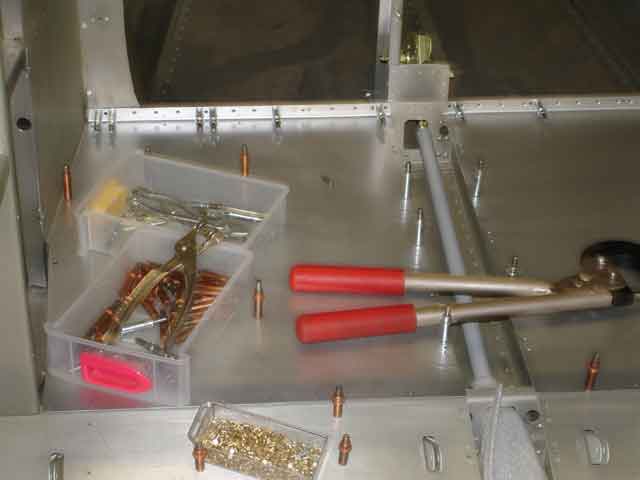 Solution - Wherever the plans call for platenuts, it is a good idea to fit a screw to each platenut BEFORE you install them. Use a little Boelube in each thread (see image 1 below) This makes it easy to start the thread of each screw or bolt. I found that I could use fingers to grasp most platenuts while turning the screw with a suitable-sized Phillips head driver (make sure it is a tight fit - too large or small will wreck the screw/bolt). Some have very tight threads, in which case you need to use pliers. In any case, running the screw through the platenut frees up the thread and makes final application of the screw a lot easier. The scond image shows an area of the fuselage where you need to install a lot of platenuts (baggage floor area). The third image shows how this is done. the large tool with th red handles is a rivet squeezer. The containers hold flush rivets (near) and "cleco" temporary rivets. Some clecos are installed at the rear flange of the baggage floor - if you look carefully, you can see one platenut fully installed. If you are not careful, you can strip a platenut, and then you must drill out the rivets and disassemble as much construction as is necessary to replace it - this can be disheartening!