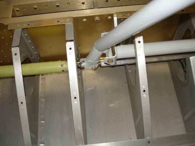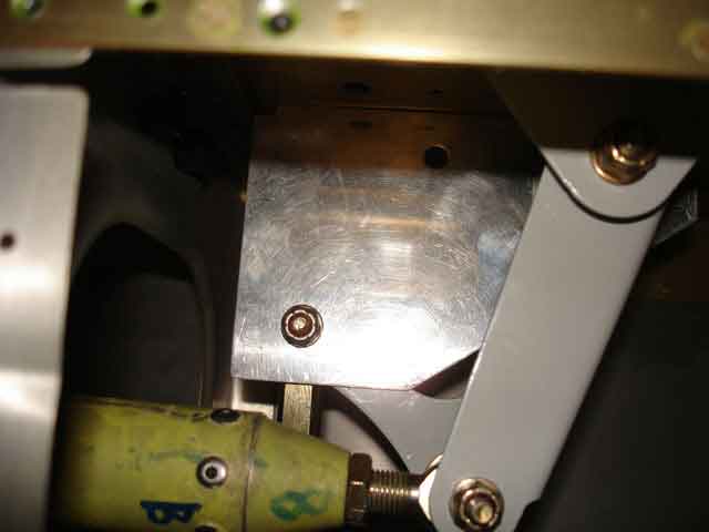 The next job was to set the aileron positions and travels. To do this you must have the flaps on the wing. Using Van's aluminium template, I positioned the bell crank in neutral and adjusted the aileron pushrod till the aileron was level with the flap in its "full-up" position. I repeated this on the left side. Next I will need to adjust the lengths of the large pushrods so that (a) the joystick is straight up with the ailerons neutral, and (b) both ailerons are neutral at the same time.