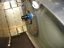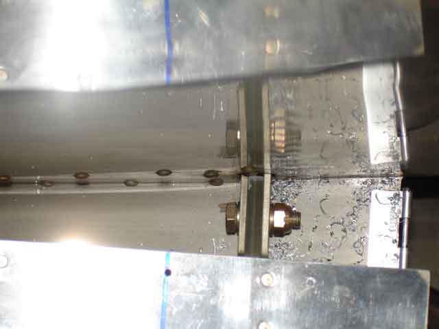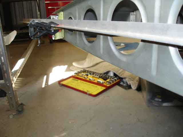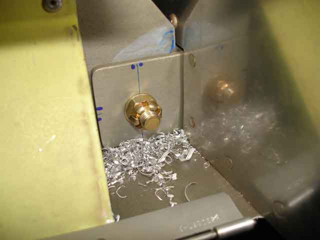 (26th September 2006) Today I spent two hours preparing to attach the wings to the fuselage. This is only a temporary attachment, and provides me with an opportunity to set some important parameters, adjust aileron travel, finalise wing attachment points, drill wing fairings and skins, and lay lines for brake hydraulic and fuel delivery. I made four 7/16" drift pins out of ordinary Grade 5 7/16" bolts. I ground the threads into a wide bulletnose so they would not mar the inside of the spar holes.