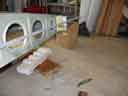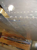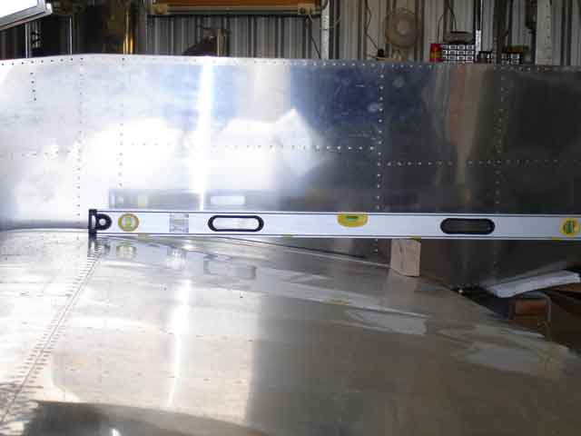 (27th September 2006) My technical counsellor (John) came over for two hours to help me with the actual wing attachment. He says he has probably mated about 2000 wings to fuselages in his career! The fuselage was supported by low (about 8") sawhorses. Another higher sawhorse supported the outboard end of the wing. John grasped this end and gently wiggled the wings as I supported the inboard wing and guided the wing spar into the fuse spar hole. It was a tightish fit, but with care went in easily. When the rear spar edge met the fuselage, the 7/16" wing attachment holes were perfectly aligned. I must have cut the spar length off correctly - thank goodness!. A light tap on two drift pins, and the wings were attached. The actual instertion of both wings took about 40 minutes and was relatively painless. Image 5 shows the result. Does it look like an airplane yet? Image 6 shows the gap between wing root and fuse which will eventualy be covered by the wing root fairing. I marked every third rivet in the wing root rib as probable locations for wing fairing attachment platenuts. The drawings are none-too-clear on exactly where these platenuts need to go (not shown).