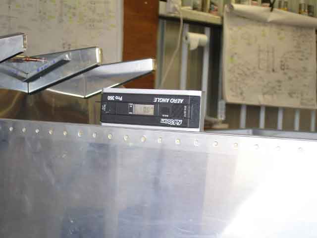(23 October 2006) Dan Checkoway recommends using the tooling holes in the outboard ribs of wings and ailerons to find the "neutral" control position. I thought this was a good idea so I used a piece of scrap Al angle, some clecos and som clamps to line up the right hand aileron (Image 1). Image 2 shows the left hand aileron also level, after the adjustment process was complete. To do this, I placed the bellcrank template in position in the right wing, and adjusted the RH thin pushrod so all was kosher. This was followed by adjustment to the RH wing thick pushrod so that both joysticks were vertical. Then the bellcrank template was moved to the LH wing and the thin pushrod adjusted (with the LH thick pushrod disconnected). Finally, the LH thick pushrod was connected and adjusted until both ailerones were "neutral" at the same time (with the RH ailerone still clamped in neutral position). This all took only about 1/2 hour, and provided up/down movements of 28 degrees amd 18 degrees. within spec!