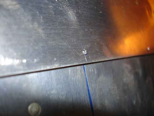 To set wing incidence, you need to make an accurate block of wood exactly 3" thick. This is laid on the rear spar attach rivet line on the upper surface, and a spirit level placed along it, resting on the rivet line of the main spar (Images 1 and 2 below). The rear wing is moved up and down until the spirit level registers that it is parallel to the upper longeron surface of the cabin (image 3).I borrowed my TC's excellent digital level meter and, once I had made the adjustments, it read 0.7 degrees in both places (on the level and on the longeron). Yes I know the picture shows this device upside-down, but when I actually did the measurements, all was kosher. I then measured 5/8" from every surface of the rear spar assembly. The bolt centre must be at least 5/8" from the edges of all the interleaving spar tabs. The blue dots in image 4 show that I had about 3/16" room to move. I marked the exact cetre of this area and, with a long 1/8" drill, carefully drilled a pilot hole, making sure the drill was normal to the surface. After double-checking that nothing had moved, I increased the drill to 1/4". The final hole was drilled with a 5/16" precision drill. I tapped the bolt in place, hand tightened and checked again - all was kosher! (images 5 and 6) This was repeated on the other side without any dramas. It was truly nerve-wracking, knowing that, if I stuffed-up, there was nowhere to go!
