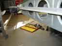 Once the wings were bolted, I crawled under the fuse and measured 3" from the marks I had made on the wing lower skin, 3" from where the platenuts go which button up the skin overlap. I was only about 8" from the skin and the light was low. Now for some good old-fashioned optometry - at age 57, my eyes have very little residual ability to focus at near. I am "presbyopic". I could not see the blue lines at all - it was all a blur. Thinking "I wish I had some +4 dioptre lenses" I realised that, as a bloody optometrist, I did indeed have some! So I went back to the house, got out my trial lens set and trial frame and shoved some +4D lenses in the frame. Image 7 shows me wearing them to look at the lower fuse. It was perfect! I could see every detail. Anyway I marked and pilot-drilled as required and then crawled out feeling very pleased.