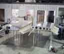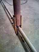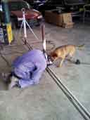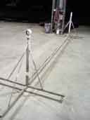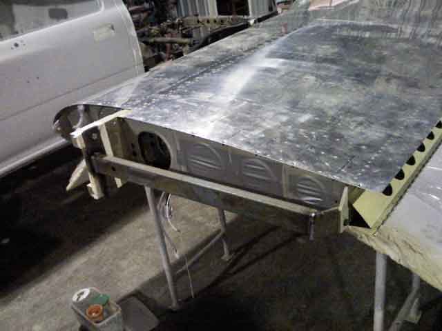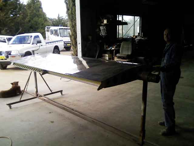 Image 1 shows my wings in his workshop, supported on two benches. Charlie is pretty meticulous, and he expained how we needed to make up a temproary jig to hold the wings' surfaces LEVEL for spray painting. He has this special heated and ventilated booth for spray painting, and he wanted the wings to be level for the best outcomes. He had already built a jig of sorts for a Cessna wing, and we proceeded to modify this to take the RV wings. Image 2 shows the part of this jig that supported the inboard spars. A piece of square section steel separates two pieces of steel plate which are drilled to match the wing mounting holes in both main and rear spars (image 2). Image 3 shows the Cessna version of the jig - much too wide for my needs. Charlie and his dog "Rex" (image 3) welded a piece of pipe to this jig (image 5) at the right position to match the width of my RV wings. Image 6 shows the wing mounted in the modified jig. The outboard wing is supported by a piece of 4" tube steel (truck exhaust pipe!) which slotted neatly into the lightning holes of the outboard wing. I spent about two hours treating the wings with a hgydrocarbon solvent (Prepsol) and Alumiprep/Scotchbrite, before finally washing the wings with water. We rolled the right wing into the spray booth and i spent another 1/2 hour wiping the surfaces with 50/50 water/meths to remove any oily residue.