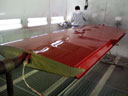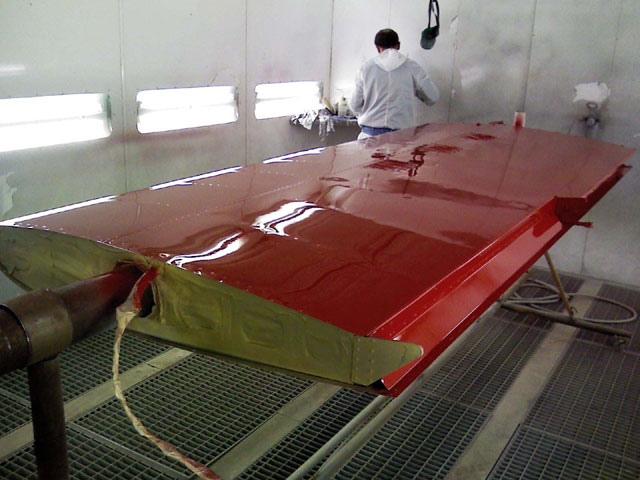 Finally we clased the door, turned on the ventilation and Charlie worked his magic with the spray gun. First one side, then rotate the wing 180 degrees using the jig, for the other side. The final outcome in in Image 7. Yep, its gonna be a RED airplane!! I am very very happy with the result. He used special PPG epoxy etch primer and undercoat, followed by two coats of PPG paint.It will be a little heavier than the Vans method, but I am not worried. I need to lose a few punds anyway.